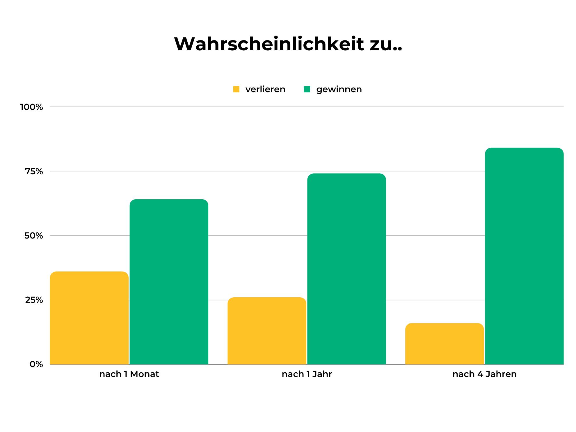 In einer Zeitspanne von einem Monat sind die Chancen nicht so eindeutig, dass dein Girokonto von Investitionen geschlagen wird. Anders sieht die Situation nach einem Jahr aus. Hier hat ein Sparkonto nur noch eine Chance von 1 aus 3, die Investition zu schlagen. Über vier Jahre sind die Chancen dann schon auf 1 zu 5 gesunken!