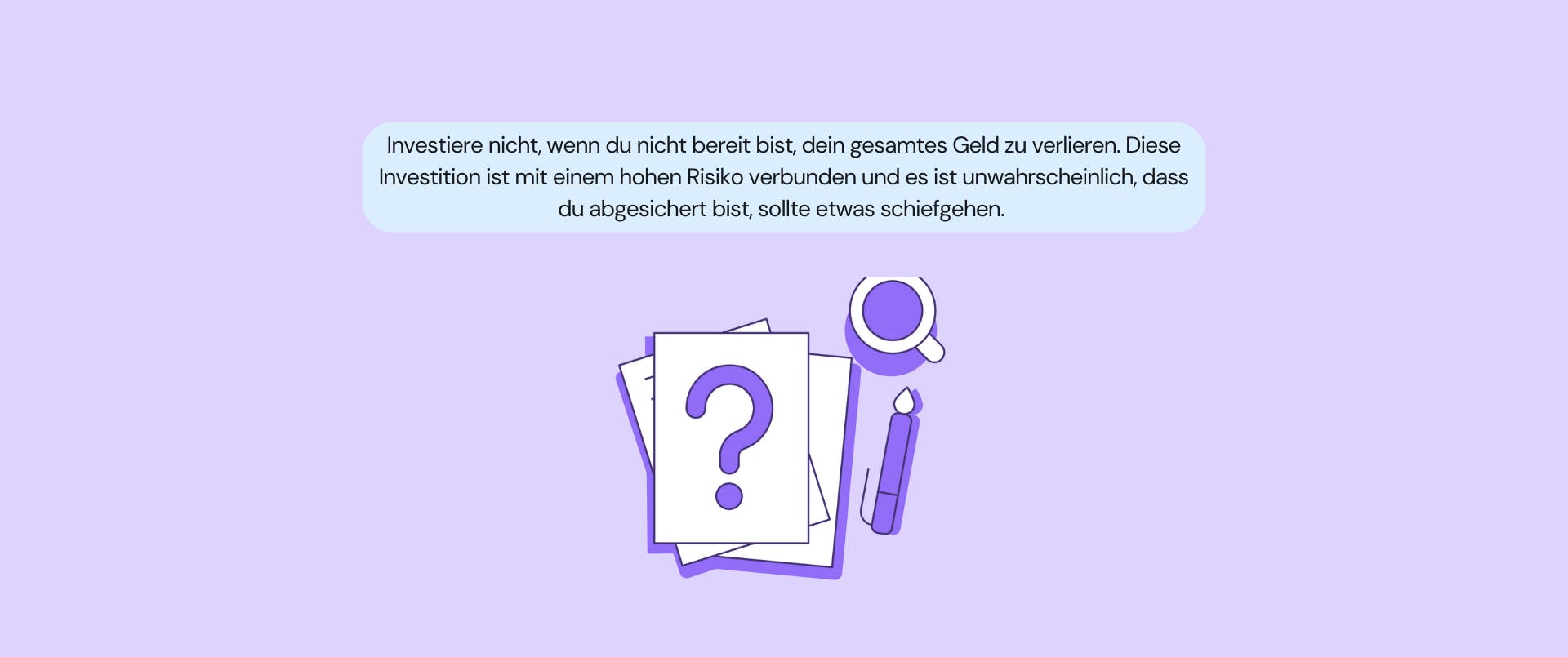 Investiere nicht, wenn du nicht bereit bist, dein gesamtes Geld zu verlieren. Diese Investition ist mit einem hohen Risiko verbunden und es ist unwahrscheinlich, dass du abgesichert bist, sollte etwas schiefgehen.