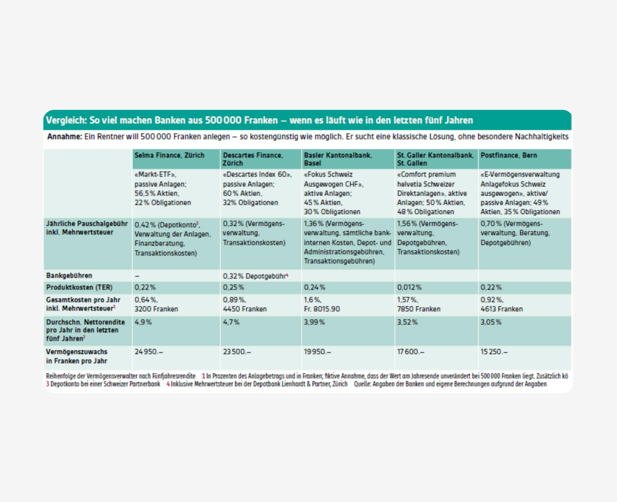 Rangiert wurde nach jährlichen Gesamtkosten, durchschnittlicher Nettorendite und dem daraus resultierenden Vermögenszuwachs pro Jahr bei einem Anlagebetrag von CHF 500’000.