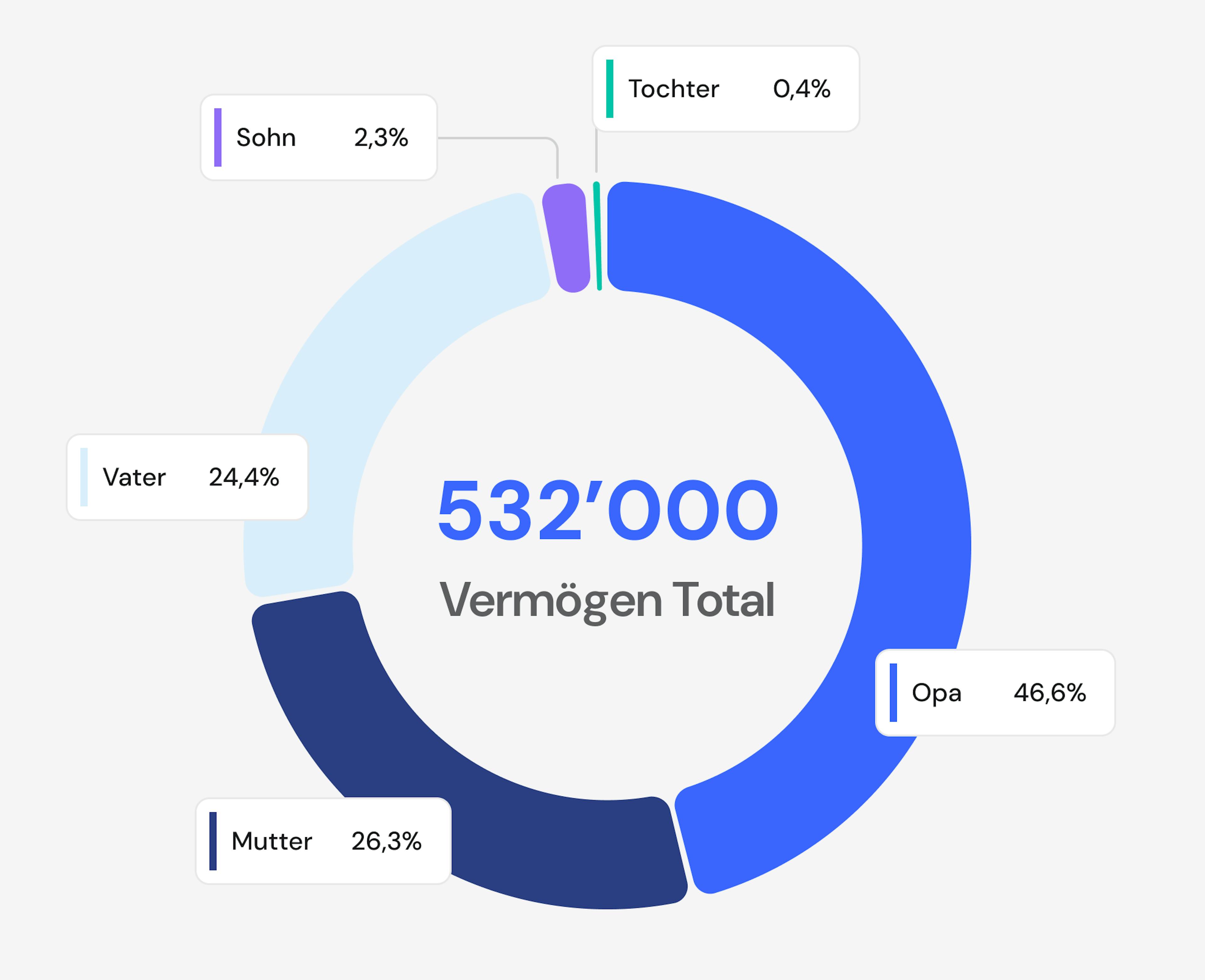 Alle erreichen eine tiefere Gebühr. Auch die Tochter mit nur 2’000 CHF und der Sohn mit 12’000 CHF profitieren sofort vom niedrigsten Gebührensatz, den sie alleine nur sehr schwer erreichen können.