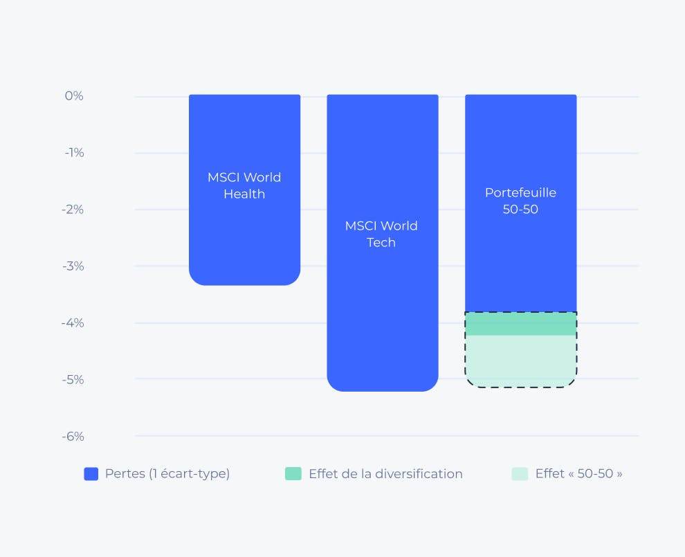 Ainsi, l'ETF technologique a connu un rendement de -5,3 % pendant deux mois chaque année, contre -3,4 % pour l'ETF axé sur la santé. En combinant ces deux ETF à parts égales dans un portefeuille, tu n'aurais toutefois pas obtenu une simple moyenne des deux chiffres (-4,3 %). En effet, ton rendement aurait été de -3,9 %. Cette réduction des pertes de 0,4 % est l'effet de la diversification !