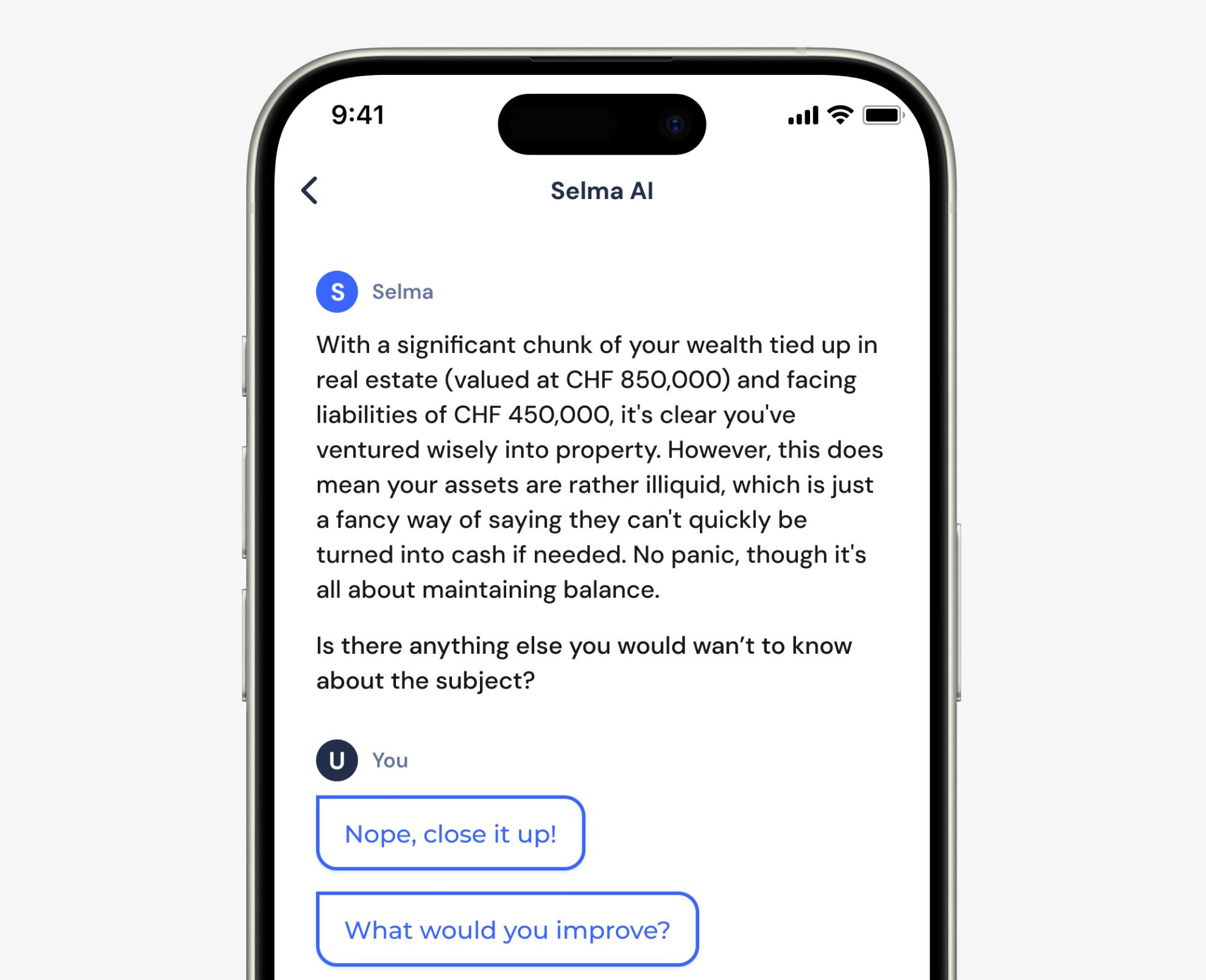 Nina was curious as well and wanted to know why her portfolio is looking the way it does. To figure this out she asked Selma AI to “analyse her portfolio.” Selma AI told her that her investment portfolio with Selma is strategically diversified, blending growth-oriented assets with safer investments to balance potential returns and stability. With a focus on growth, a significant portion of her investments is allocated to equities worldwide, including Swiss and international companies, and exposure to emerging markets. Safer investments include global and Swiss bonds, provide stability and regular income, thus mitigate overall the risk of the portfolio. Investments in private equity and precious metals offer opportunities for growth and serve as hedges against inflation and currency devaluation. Nina also got to know that this diversified approach aligns with her risk tolerance and aims for long-term growth and stability.