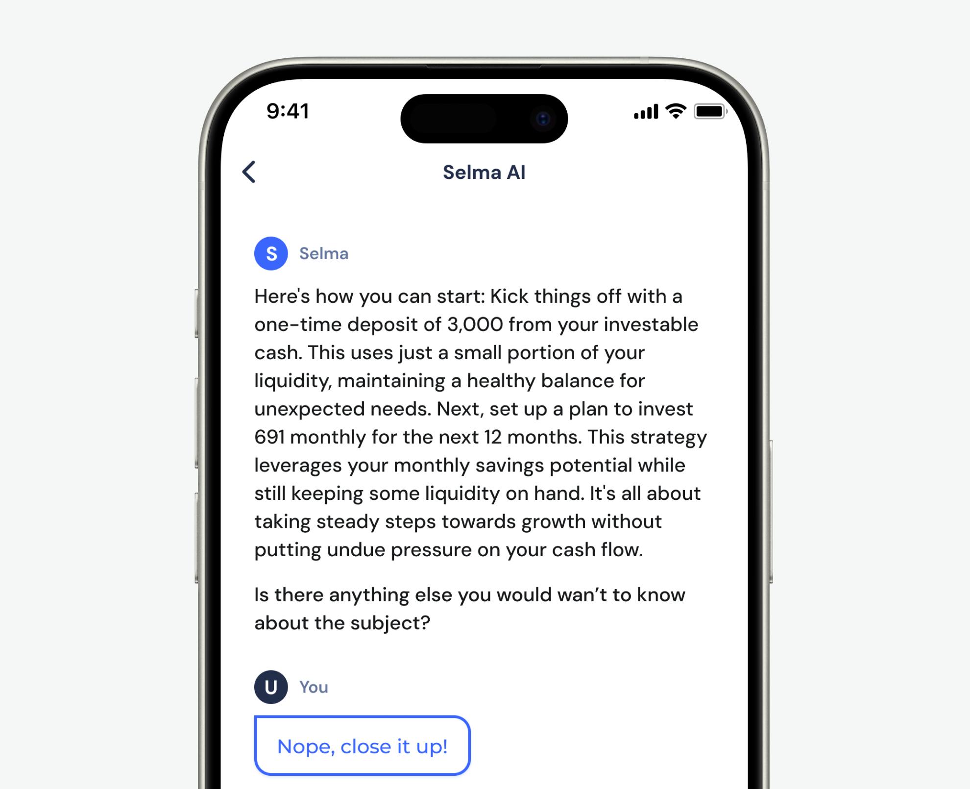 Nina knows it is time to do something “smart” with her money. Since inflation is eating up her hard-earned money in the bank account she is considering long-term investing. But how? After some research, she stumbled over Selma and wanted to give it a go (especially since the investment plan is for free 😉). In a matter of minutes, Nina finished her chat with Selma and received her investment plan. So what now? Nina is unsure if her current financial state is really good enough to even be able to invest. This is where Selma AI comes into play. With a quick check on the mobile app, Nina can ask exactly all the questions that are stuck in her mind.