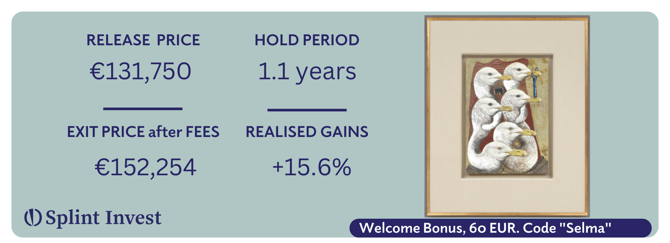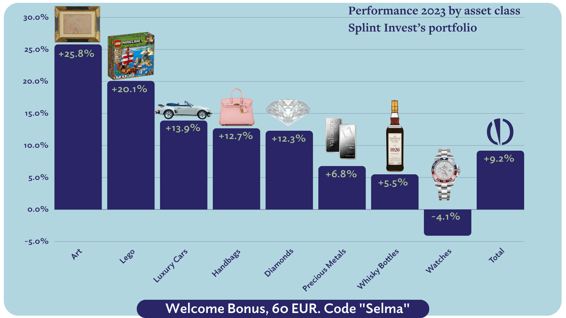 For example, Splint Invest assets outperformed several benchmarks in August 2024, with some outpacing the S&P 500 (+3.9%) and the DAX (+2.2%). Over the same period, an artwork by Raghav Babbar, an emerging artist, rose by six percent.